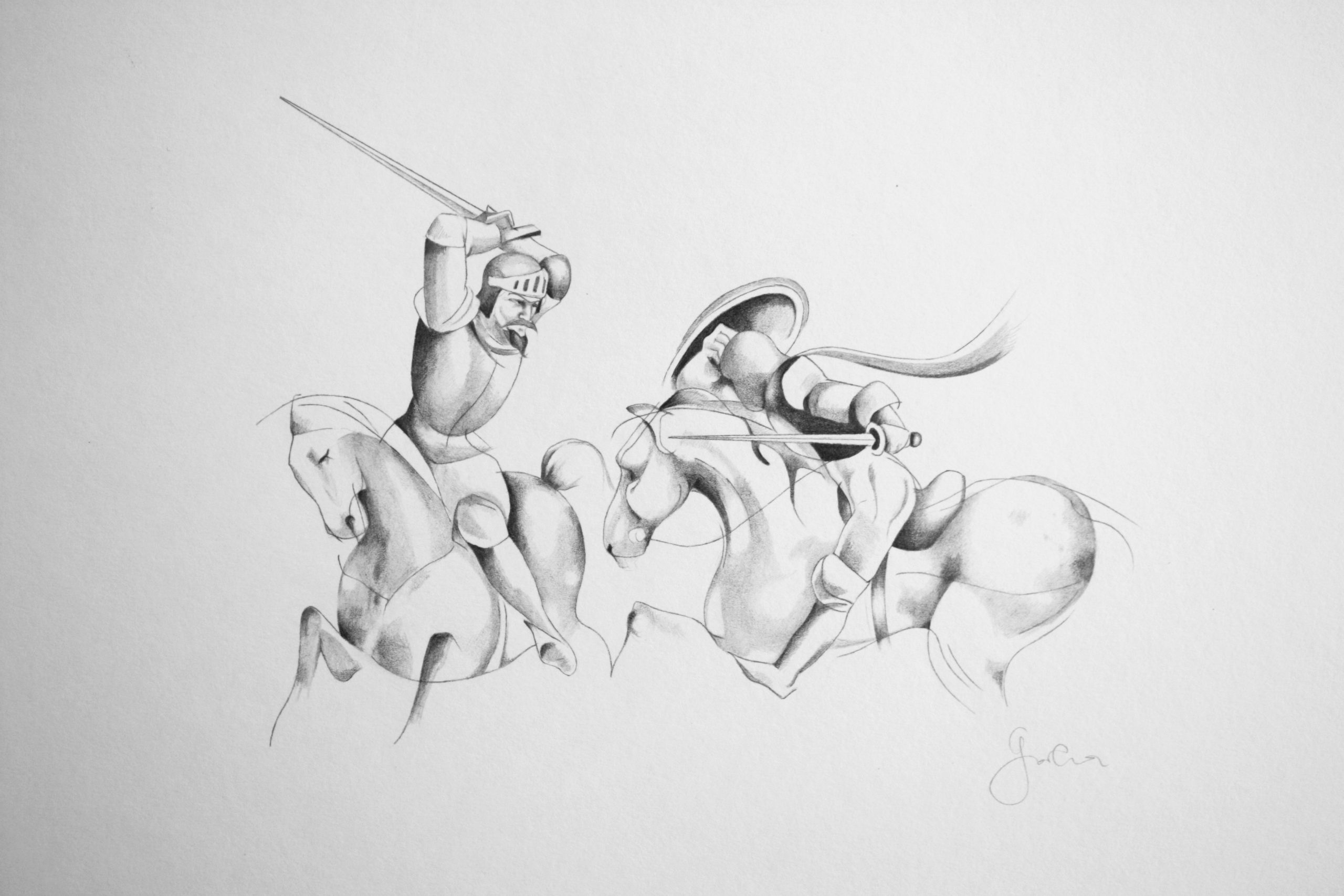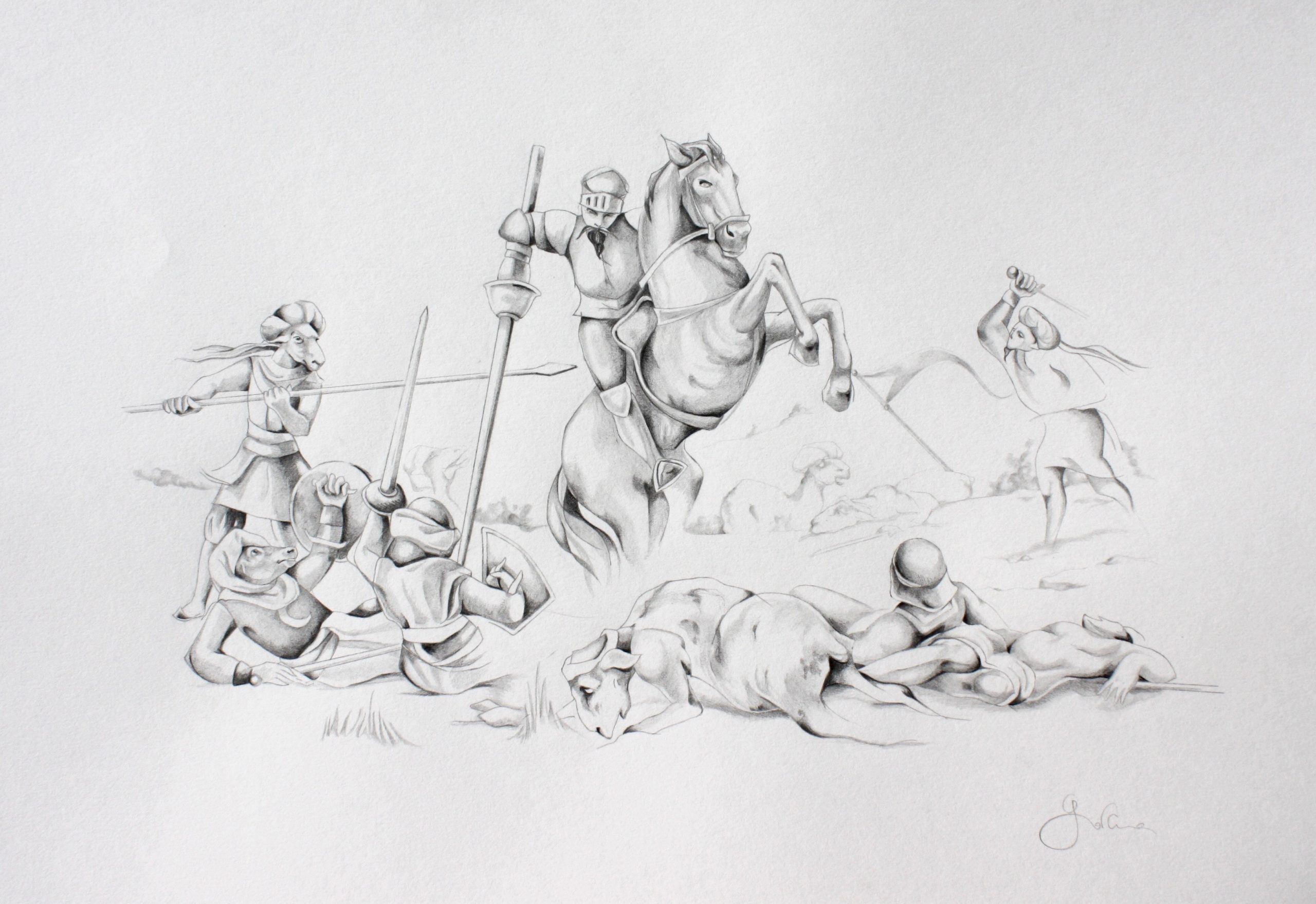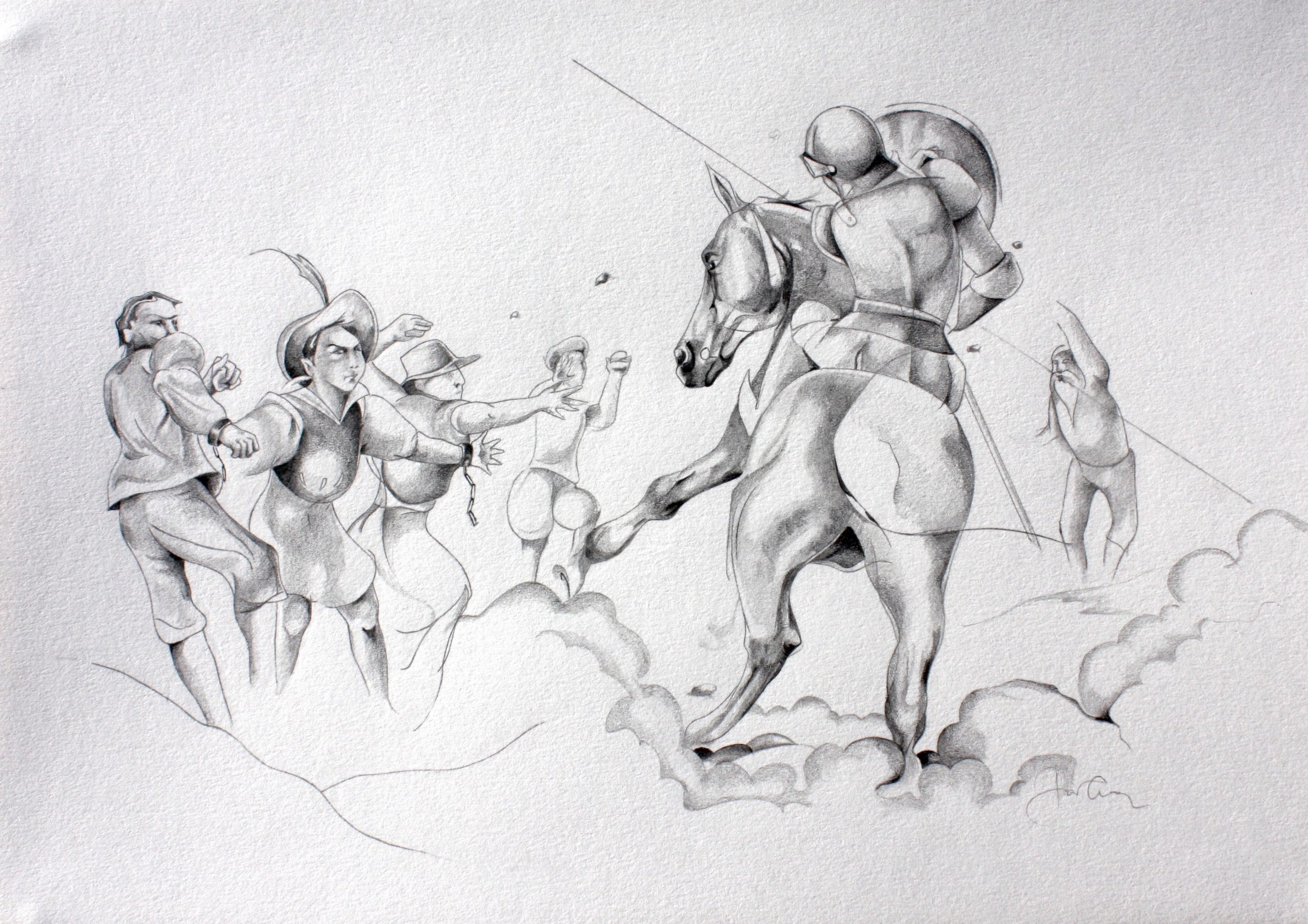 Charge héroïque contre l’armée d’Alifanfaron, seigneur de Taprobane, mines graphites, 29 x 39 cm, 2014