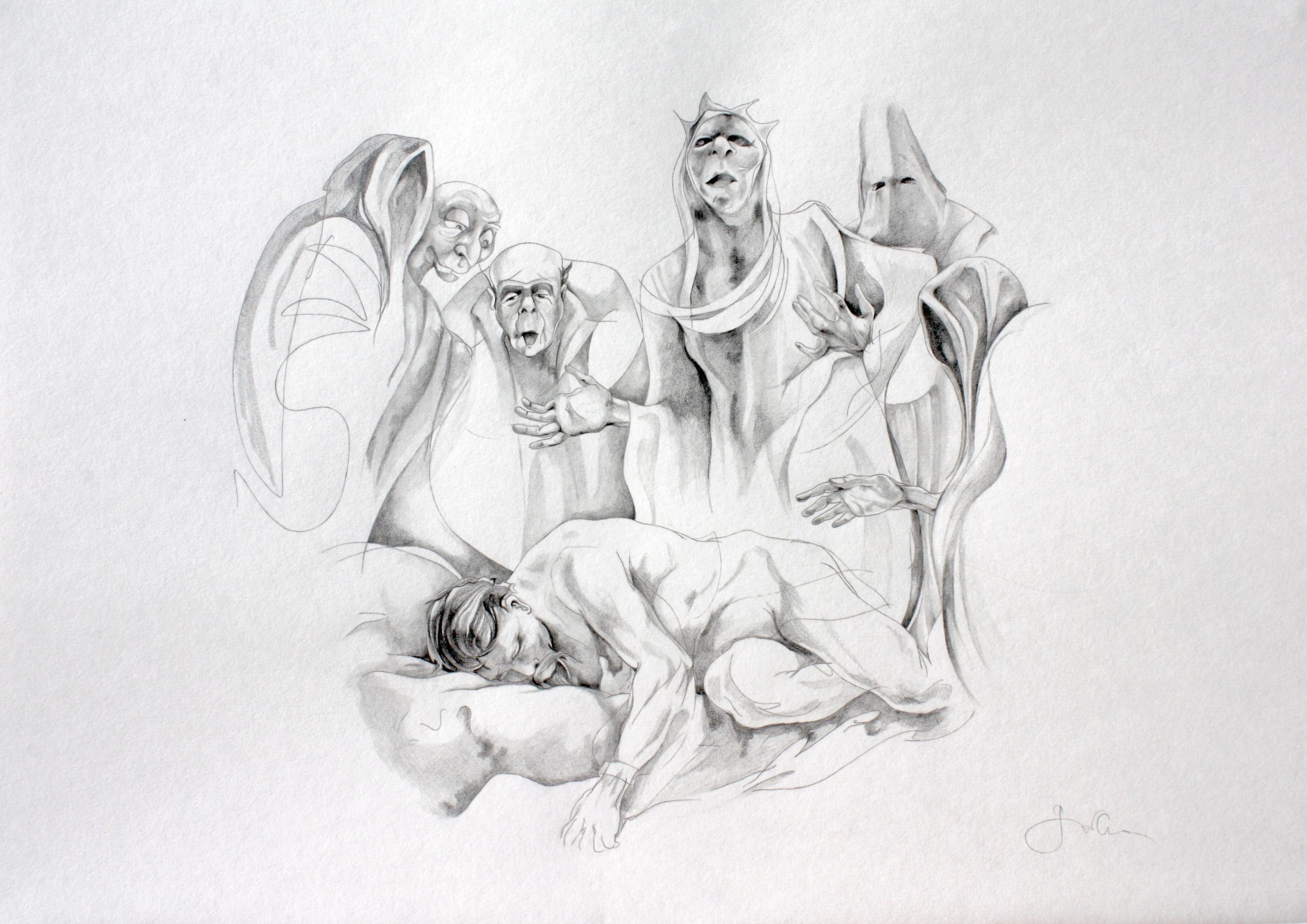 Spectres du château ensorcelé surprenant Don Quichotte dans son sommeil, mines graphites, 29 x 39 cm, 2014.