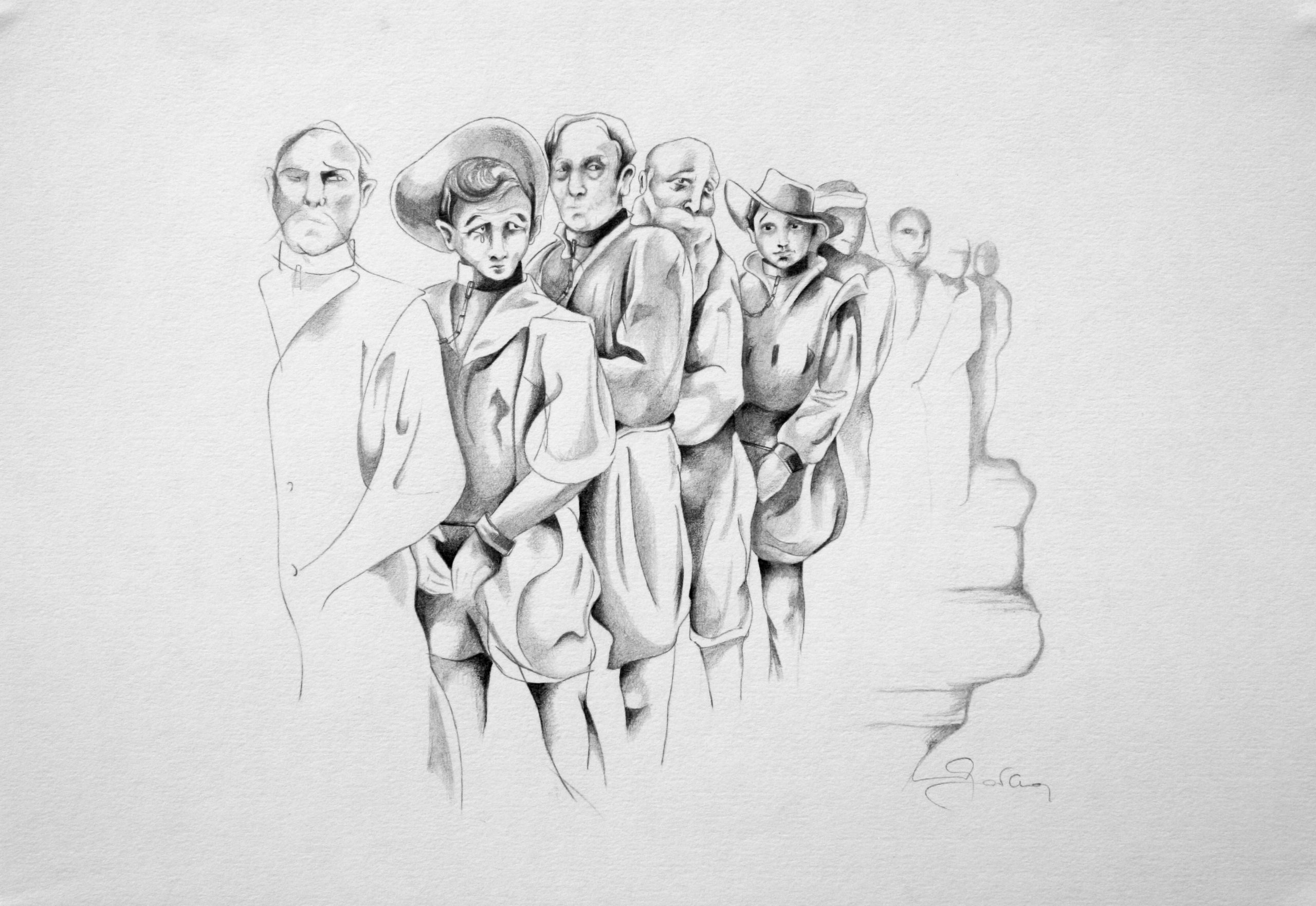 Galériens sur le chemin des Dames Gourapes, mines graphites, 17 x 23 cm, 2014.