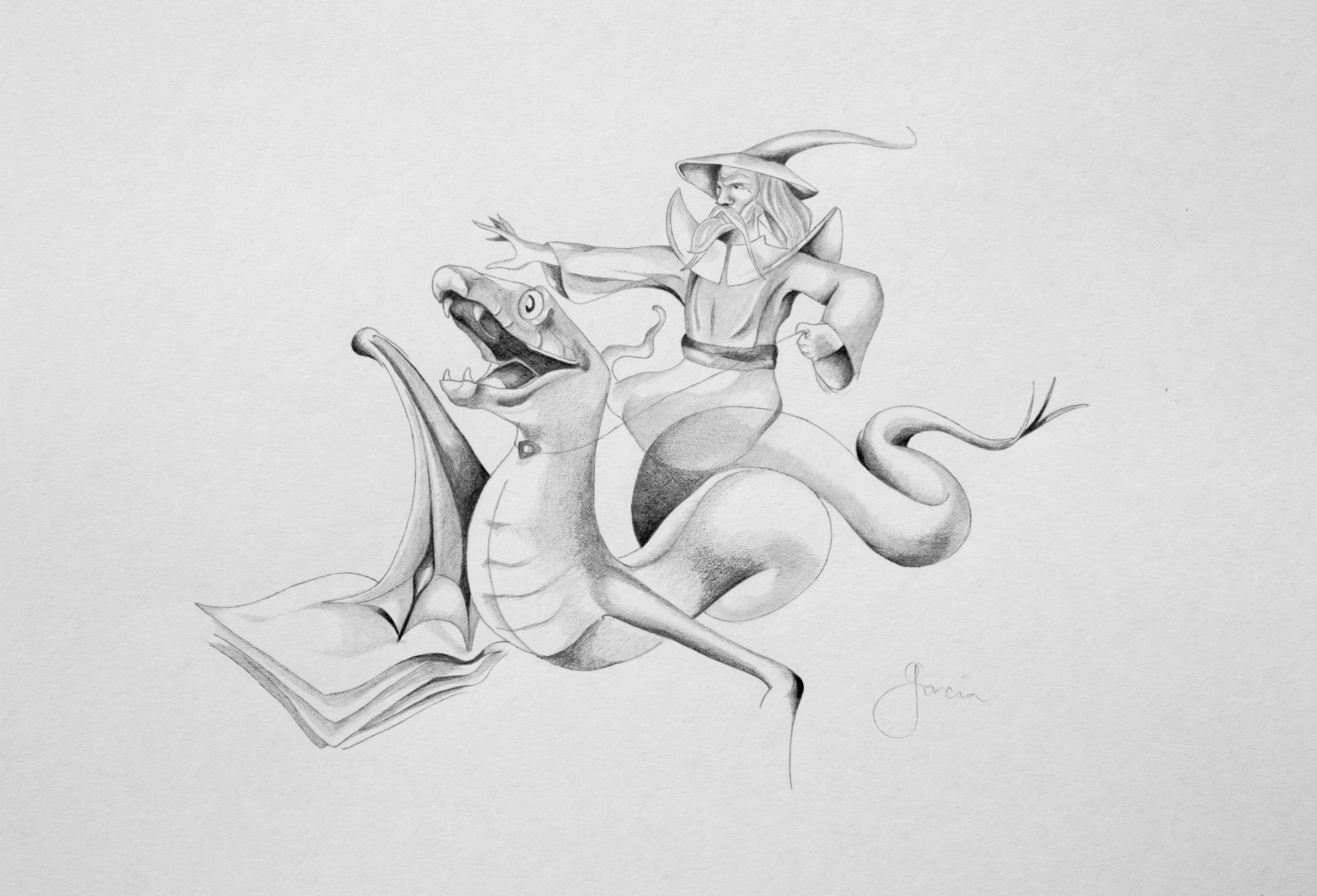 Freston descendant de son serpent ailé, mines graphites, 17 x 23 cm, 2014.