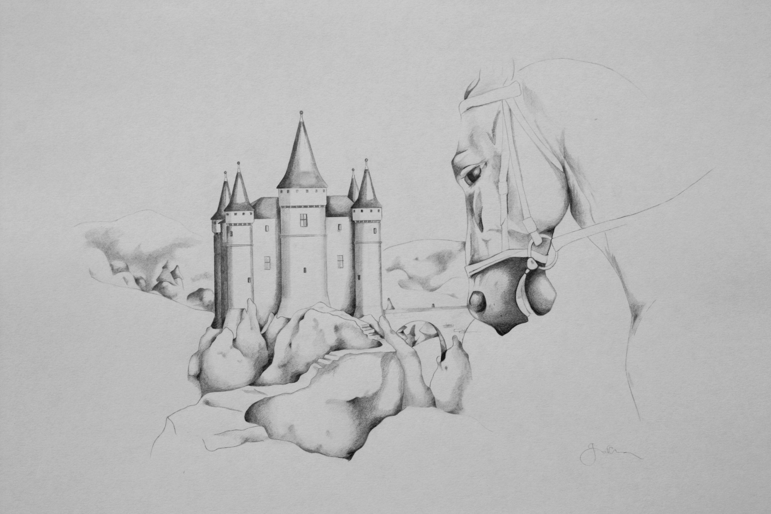 Le château aux tours argentées, mines graphites, 20 x 29 cm, 2014.