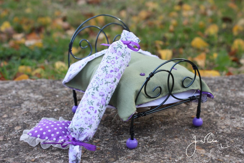 - un édredon (12,5 x 11,5 cm) en toile de coton uni couleur vert amande, doublé d’un coton violet à pois blancs