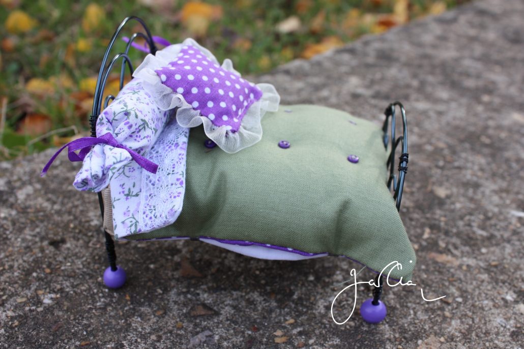 - un oreiller (4 x 4 cm) en tissu de coton violet à pois blancs