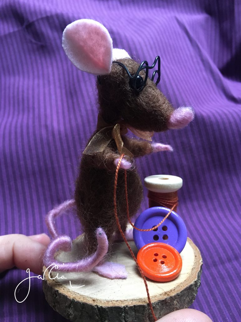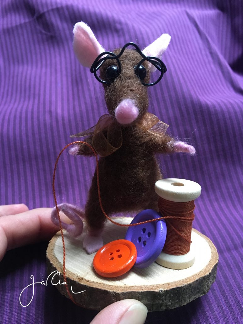 Matières : laine cardée, feutrine, ruban polyester, bois, acrylique